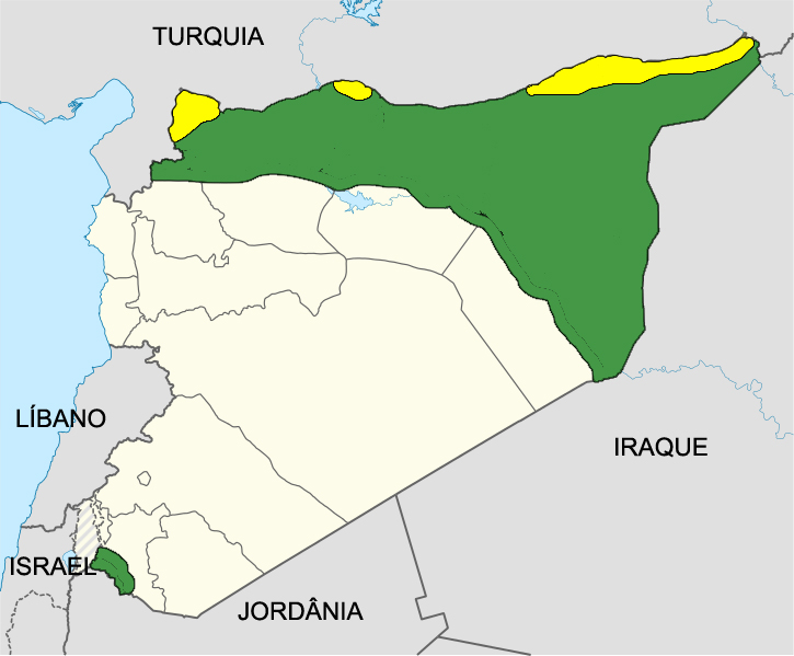 Em verde, áreas controladas pela oposição síria (Coalizão/Mujahidins), em amarelo, áreas controladas pelos curdos.