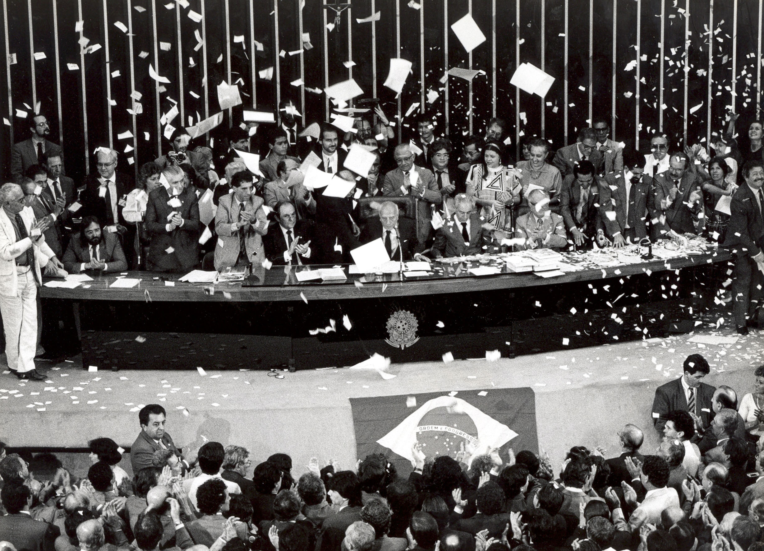 O Presidente da Constituinte, como vocês devem saber ou já devem ter ouvido falar, era o advogado paulista Ulysses Guimarães, na época no PMDB, do chamado “Centrão”. Além de Presidente da Constituinte, foi pré-candidato às eleições presidenciais, participou das Diretas Já e morreu em um acidente de helicóptero que, digamos, nunca foi muito esclarecido. Pela sua relevância política no processo da Constituinte, recomendo assistir suas duas participações no programa Roda Viva, da TV Cultura. Todos os vídeos estão neste link.