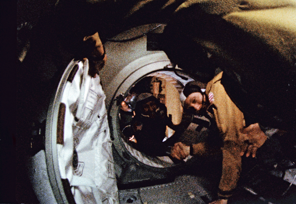 O astronauta Thomas P. Stafford e o cosmonauta Aleksei A. Leonov se cumprimentam no espaço em 17 de Julho de 1975, durante a acoplagem da Soyuz soviética com uma Apollo dos EUA. Foto: NASA