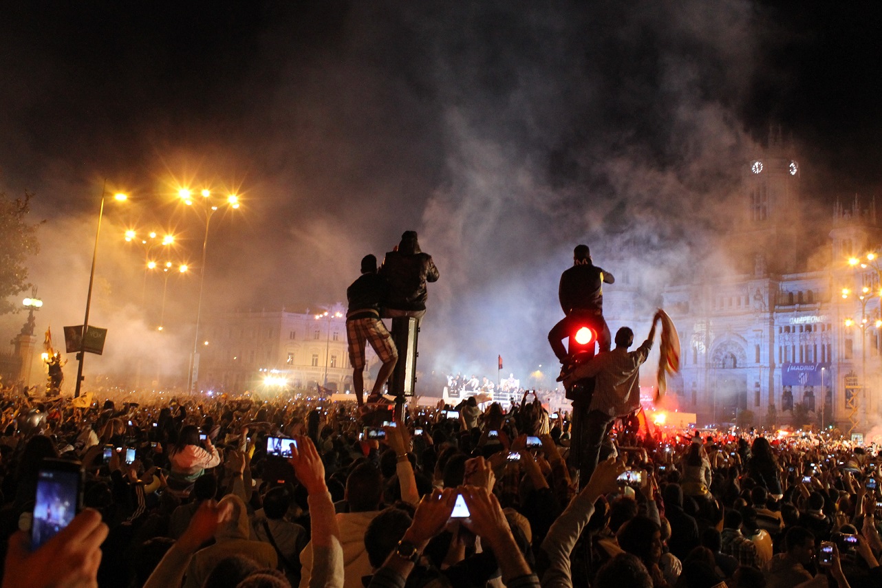 Daí pra frente a comemoração se transformou em uma enorme balada na rua, música eletrônica, muita cerveja, turistas, estrangeiros e pessoas tirando suas próprias fotos na festa (selfies). Além de outros que me pediam para fotografá-los no evento, talvez pensando que fossem sair em algum grande jornal do dia seguinte. Por outro lado, senti falta das canções de futebol e bandeiras do Real Madrid. Não faltou proteção policial cercando a fonte no meio da praça e fazendo uma revista em todos que fossem acessar ao perímetro da festa, mesmo assim eram frequentes as pequenas explosões de rojões e sinalizadores o que eu, particularmente, gosto.