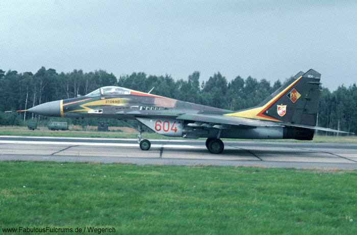 Mig-29, um dos principais aviões de combate do mundo na época, da RDA, com pintura comemorativa. Já com as cores da bandeira da Alemanha unificada, o avião se prepara para o último voo da Força Aérea da RDA. Abaixo do cockpit, parte da pintura comemorativa, a data 27/09/90.