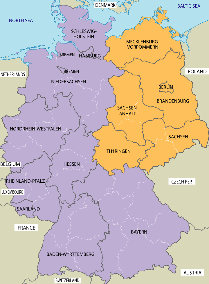 Mapa em inglês dos estados da República Federal da Alemanha; em laranja, os novos estados, que compunham a antiga República Democrática Alemã, RDA.