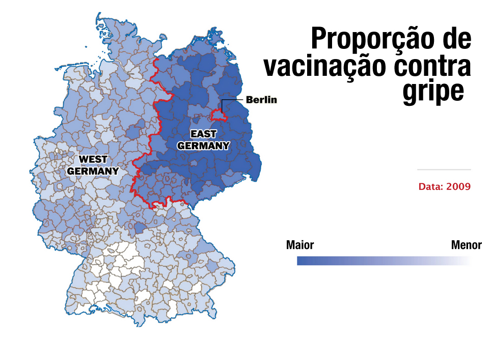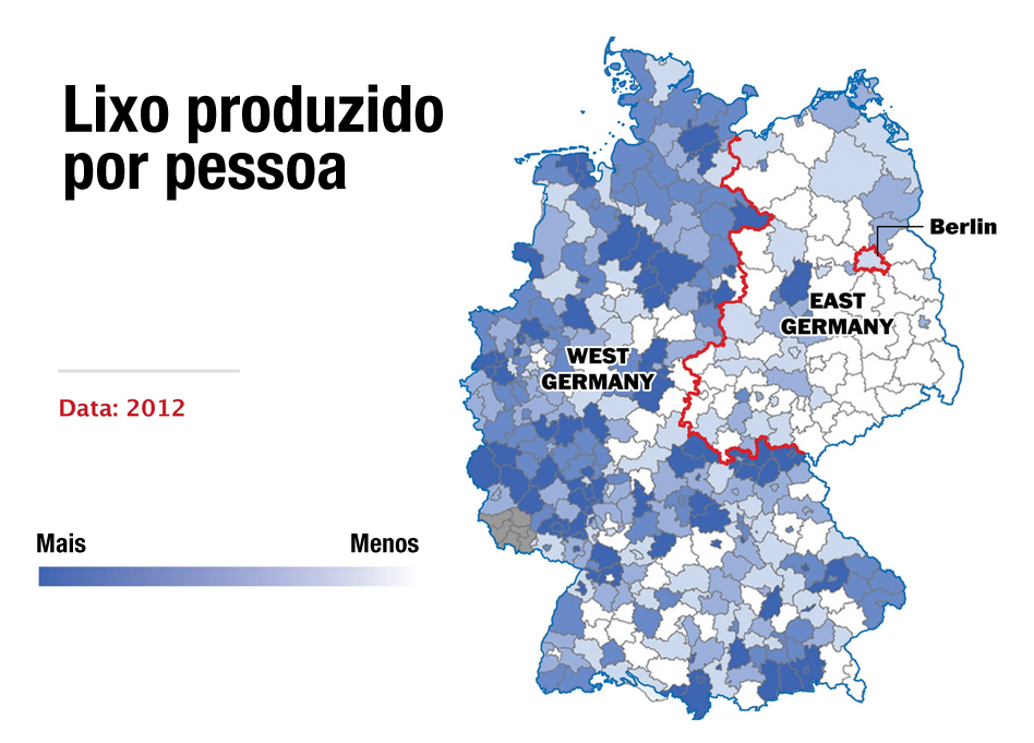 Outro aspecto interessante é o de responsabilidade e papel social, além da relação do indivíduo com o Estado. O lado oriental da Alemanha produz menos lixo, pois consome menos e reutiliza produtos recicláveis. Sãos mais vacinados, já que as campanhas de vacinação eram obrigatórias na RDA. Quase a totalidade das crianças frequenta creches, pois a mulher era incentivada ao mercado de trabalho. Finalmente, existe uma diferença no tamanho das propriedades rurais. Enquanto no lado ocidental da Alemanha prevalecem pequenas propriedades privadas familiares, no lado oriental as fazendas foram reestruturadas em propriedades maiores. O motivo? Na RDA, a produção agrícola era feita em cooperativas com diversas famílias, com a propriedade coletiva da terra. Temas como aborto, religiosidade e legalização das drogas também possuem grande discrepância entre os dois lados da Alemanha. O leitor pode acessar um infográfico bem legal, em inglês, no site do jornal Die Zeit, sobre questões sociais.