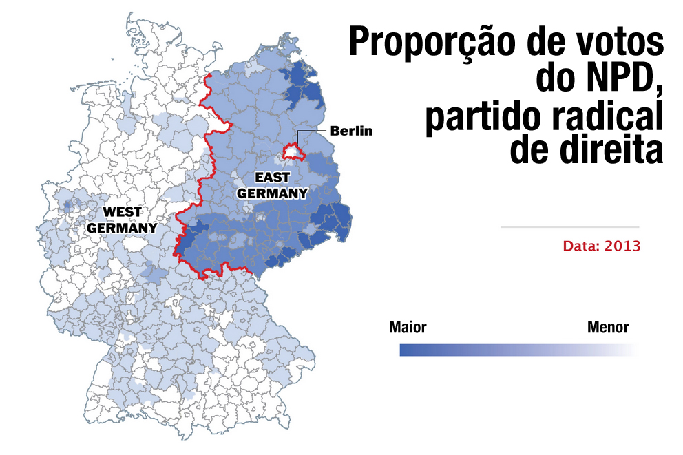 E, claro, existe o outro lado da moeda da Ostnostalgie. O repúdio ao socialismo e seus símbolos, misturado ao menor desenvolvimento econômico, faz com que seja no lado oriental da Alemanha que o partido de extrema-direita NPD (Partido Nacional Democrata) tenha seu maior público. Acusados de ligações com grupos neonazistas e de violarem as leis que proíbem a adulação do regime de Adolf Hitler, o NPD possui presença minúscula nas instituições políticas alemãs, com cinco representantes nos parlamentos estaduais, nenhum representante no parlamento federal e um representante no parlamento europeu. Todos seus representantes, entretanto, foram eleitos no estado oriental de Mecklenburg-Vorpommern.