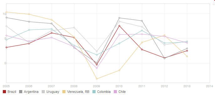 Não se ponha a culpa nas circunstâncias, em crise, enfim, nos outros. Comparando os nossos resultados no período com países sul-americanos como Argentina, Uruguai, Colômbia, Chile e Venezuela, vê-se o desastre: crescemos menos que esses países no período, com exceção do Uruguai em 2011, quando crescemos 0,1% a mais que eles, e da Venezuela em 2013.