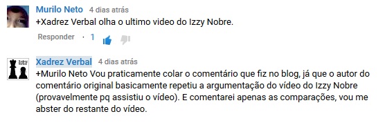 Então eu estou reclamando de críticas ou de discordarem de mim? Não, estou apontando que a forma feita não é a melhor. Por exemplo, com youtubers com quem eu tenho mais contato e intimidade, eu posso (e faço) críticas e comentários, até incisivos, em privado; um deles, pra dar um exemplo concreto, é um youtuber grande, que ajudou muito o meu canal e tem sobrancelhas lindas, vocês sabem de que eu falo. Agora, com alguém que você não conhece? Pra quê? E, novamente, o próprio Izzy tuitou sobre isso esses dias, sobre como a maneira com que as pessoas comentam na internet não é a maneira com que elas chegam numa mesa. E o Xadrez Verbal não foi criado, em nenhuma de suas mídias, pra ficar brigando.