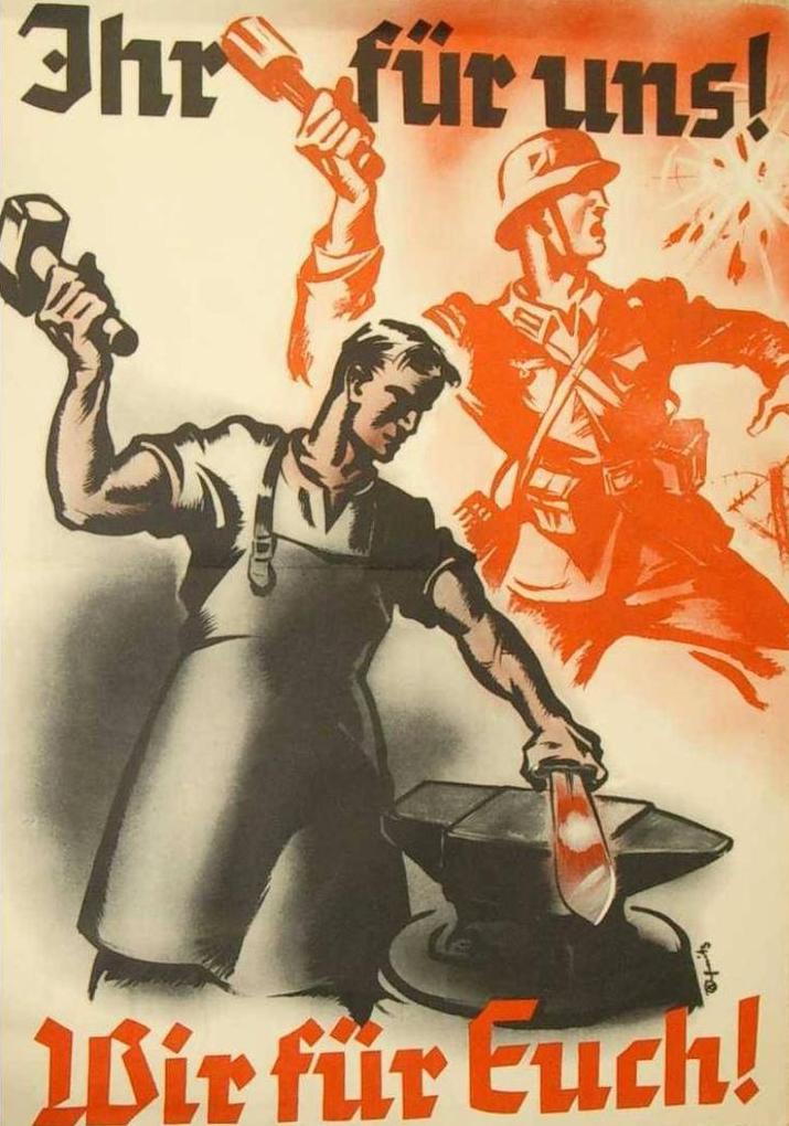 Soldados e Operários – 4 Publicado em 4 de novembro de 2015 por Xadrez Verbal Deixe um comentário ALEMANHA: “Ele por nós. Nós por você.”. O soldado que arremessa a granada simétrico, na mesma posição, ao operário que produz a espada. Anterior Avançar Voltar ao Economia de Guerra, propaganda e arte: pôsteres das Guerras Mundiais