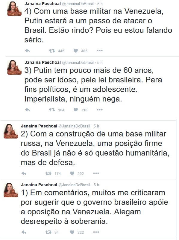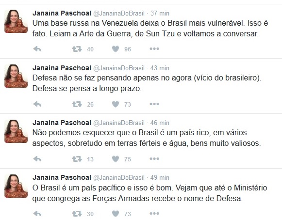 Hoje, dia 25 de outubro de 2016, a advogada e professora de Direito Penal da Universidade de São Paulo Janaina Paschoal fez alguns comentários em seu Twitter sobre a negociação para uma base militar russa na vizinha Venezuela. Devido seu papel no processo de impeachment de Dilma Rousseff, Janaina Paschoal é, sem dúvida, alguém de alcance e relevância no Brasil atual; tanto que seu nome, diversas vezes, inclusive hoje, esteve nos principais tópicos da mesma rede social. Sua figura, seu papel no processo político e sua postura como militante não são o cerne deste texto. A pessoa também não é, o espaço discute ideias. Com o alcance das ideias de Janaina Paschoal, torna-se interessante a discussão se realmente a Rússia é uma ameaça ou tem interesses em invadir o Brasil, como ela difundiu. Para sustentar essa discussão de ideias, intencionalmente o texto estará carregado de links, que permitem a leitura fluida para alguns e o aprofundamento para os que assim desejarem.