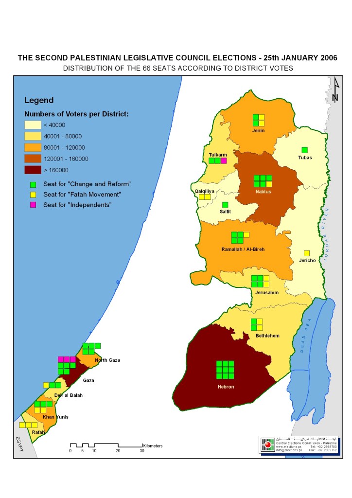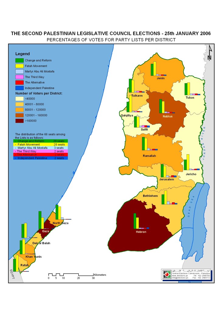 Olhando o mapa oficial dos resultados, vemos que, dos cinco distritos da Faixa de Gaza, o Hamas não teve a maioria dos votos em três deles. No distrito da cidade de Gaza, onde teve sua mais expressiva vitória, o partido teve cerca de 57% dos votos, e os resultados estão salvos aqui.