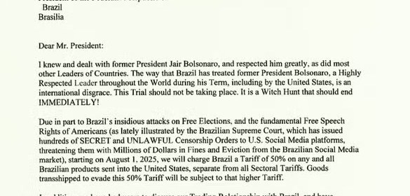– A carta anuncia tarifas de 50% sobre produtos brasileiros e supostamente entrará em vigor em 1º de agosto